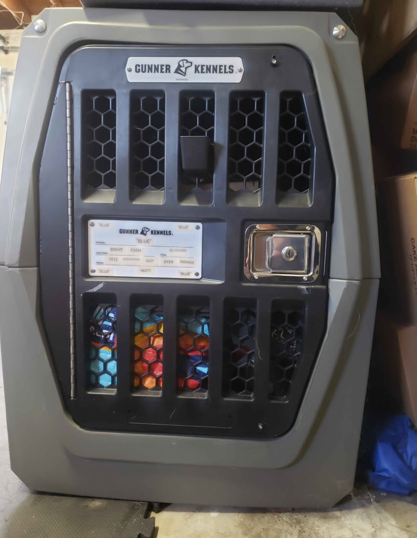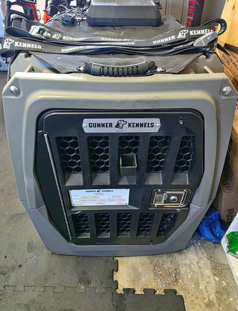 Large GUNNER Kennel for Sale – Excellent Condition! GUNNER Kennel includes weather jacket, Orthopedic GUNNER pad, GUNNER mounted water Bowl, and Fan.