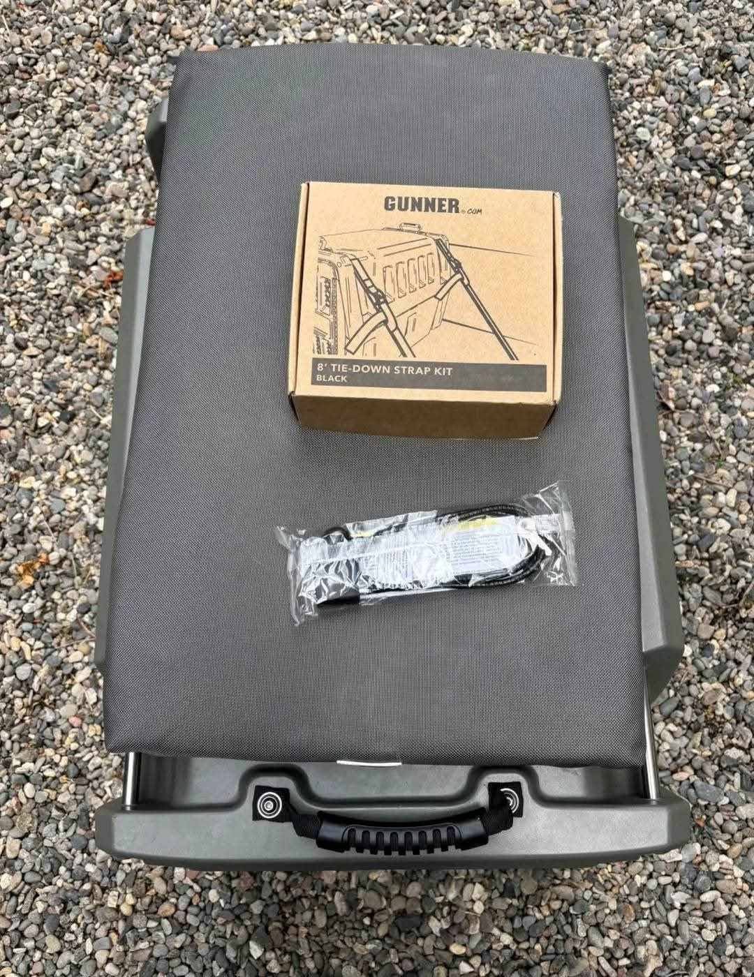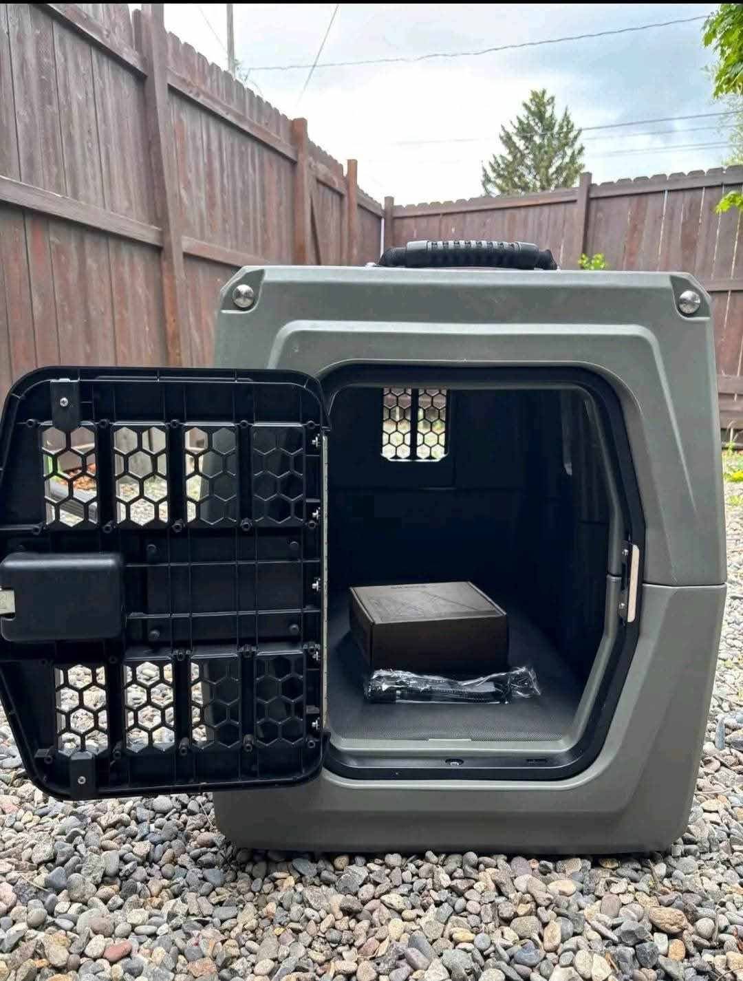 We currently have a small-size Gunner kennel in gunmetal gray available. The kennel is like new and has only been used indoors.
